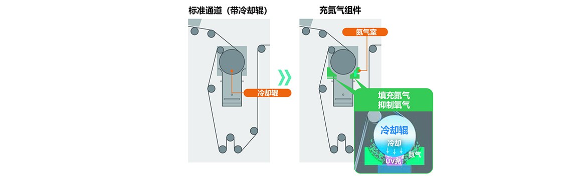 Truepress Jet L350UV+LM產(chǎn)品配備的網(wǎng)屏公司新研發(fā)的充氮裝置。氧氣會抑制UV墨水固化,而網(wǎng)屏公司的創(chuàng)新技術(shù)可將氧氣濃度降至最低,以加速UV墨水固化。